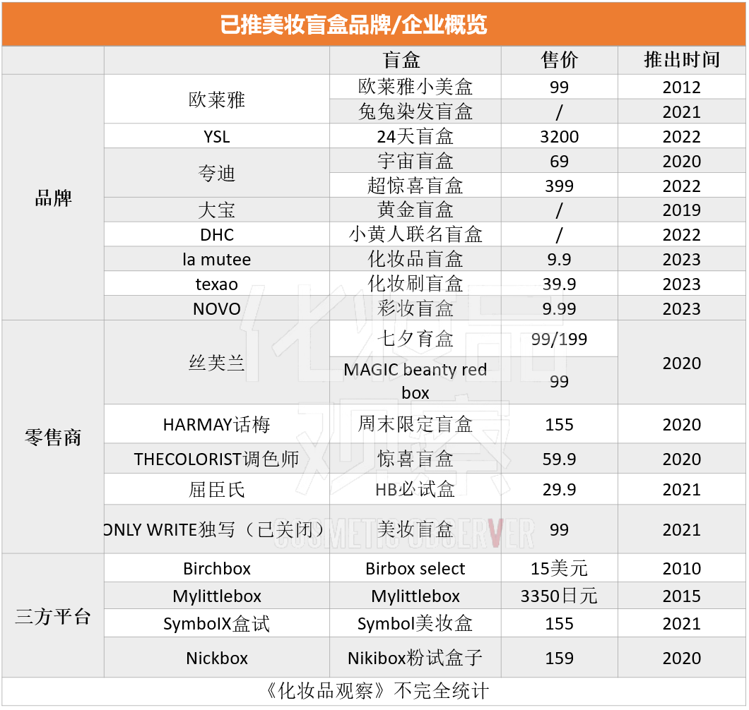 《化妆品观察》不完全统计,包括欧莱雅、YSL等品牌,丝芙兰等零售商皆推出了盲盒美妆产品,此外,国内数家美妆盒子订阅平台也于近年兴起争夺这块市场。